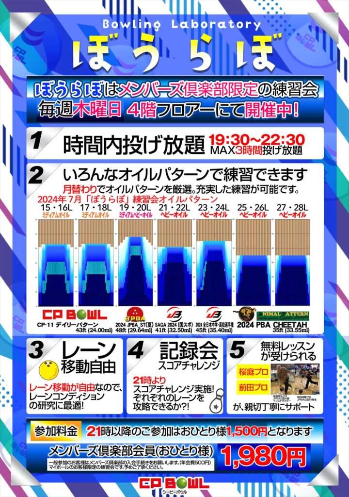 7月のぼうらぼ! 2024.07.04 お知らせ イベント Post Share Hatena LINE RSS feedly Pin it note この記事のタイトルとURLをコピーする メンバーズ俱楽部限定練習会 7月の「ぼうらぼ」ご案内です! 開催日 7/4(木)・11(木)・25(木) 時 間 19:30~22:30(3時間投げ放題) 21:00~スコアチャレンジ実施 参加費 メンバーズ倶楽部会員 お1人様 1,980円 Post Share Hatena LINE RSS feedly Pin it note 7月17日(水)きみちゃれ開催! 前の記事 プロが教えるジュニアボウリング教室 8/3開催 次の記事