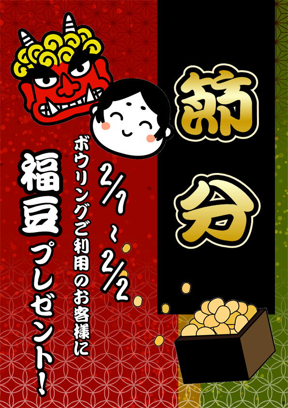 2/1・2/2は節分豆プレゼント! 2025.01.24 お知らせ イベント Post Share Hatena LINE RSS feedly Pin it note この記事のタイトルとURLをコピーする 1日(土)、2日(日)でボウリングご利用のお客様に福豆プレゼント! 鬼退治の準備はCPボウルで!! Post Share Hatena LINE RSS feedly Pin it note 祝・成人の集いパック 1/11(土)~1/13(月) 前の記事 2/10~2/14 ❤バレンタインチャレンジ❤ 次の記事