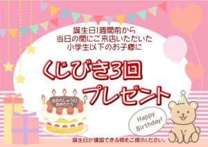 お誕生日プレゼント(小学生以下のお子さま限定) 2022.09.02 お知らせ イベント Post Share Hatena LINE RSS feedly Pin it note この記事のタイトルとURLをコピーする お誕生日の1週間前から当日の間にご来店いただいた小学生以下のお子さまに【くじびき3回プレゼント】いたします🎁 ※誕生日が確認出来る物をご提示ください。 Post Share Hatena LINE RSS feedly Pin it note 夏休みガラポン開催8/24迄! 前の記事 9月10月 大学生サークル&部活応援キャンペーン! 次の記事