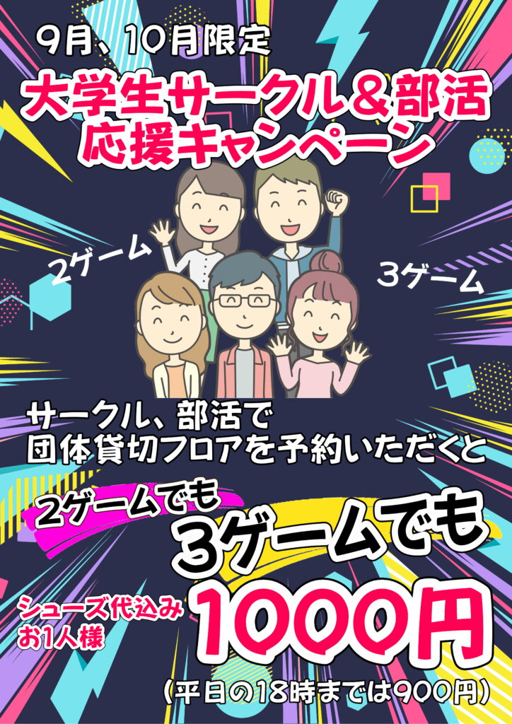 サークル、部活で団体フロアをご予約いただくと、2ゲームでも3ゲームでもシューズ代込みで1,000円です!