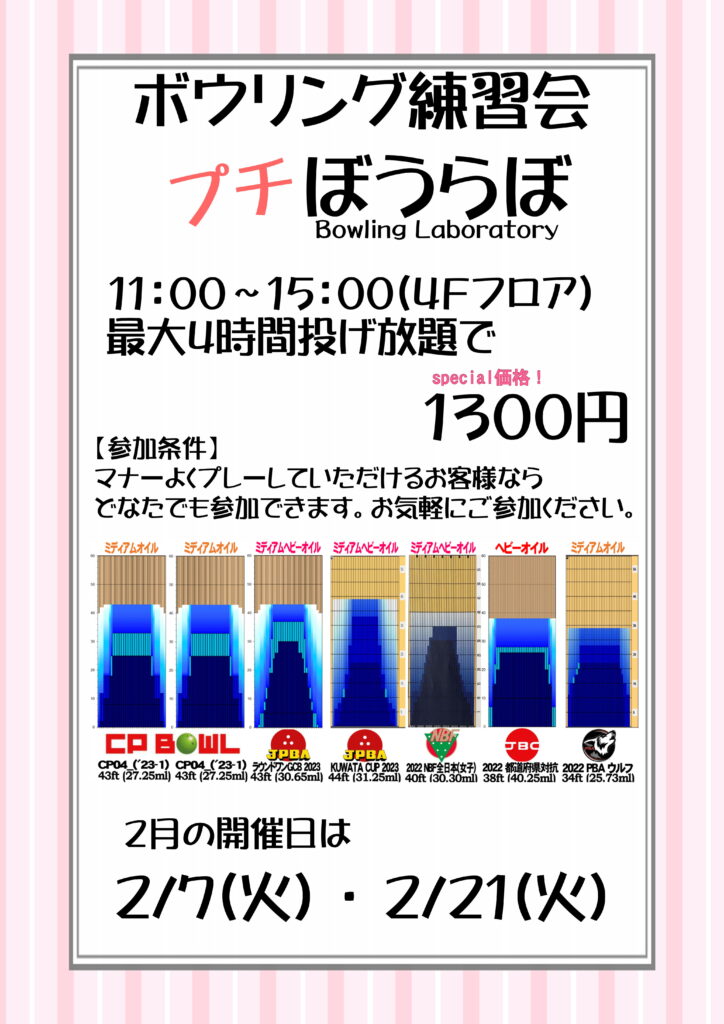 2月プチぼうらぼ 2023.02.04 お知らせ Post Share Hatena LINE RSS feedly Pin it note この記事のタイトルとURLをコピーする ボウリング練習会「プチぼうらぼ」 11:00~15:00(4Fフロア) 最大4時間投げ放題 2月の開催日は2/7(火)・2/21(火) 【参加条件】マナーよくプレーしていただけるお客様ならどなたでも参加できます。 お気軽にご参加下さい! Post Share Hatena LINE RSS feedly Pin it note 2月ぼうらぼ 前の記事 5月イベントカレンダー 次の記事