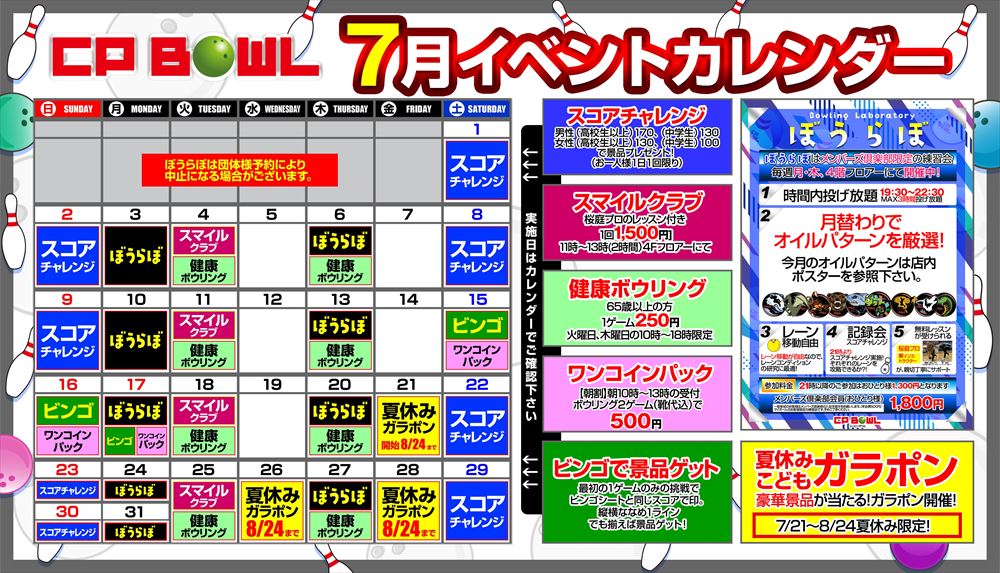 7月イベントカレンダー 2023.07.04 お知らせ イベント Post Share Hatena LINE RSS feedly Pin it note この記事のタイトルとURLをコピーする 7月のイベントカレンダーが出来ました。 7月と言えば夏休み!こどもガラポン抽選会が7/21~8/24の間開催されます。今年も豪華景品を準備してお待ちしております Post Share Hatena LINE RSS feedly Pin it note 6月22日はボウリングの日 前の記事 ジュニアボウリング教室8/5・8/26 土曜開催 次の記事