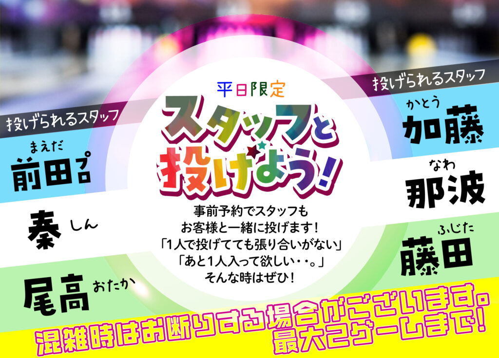 平日限定!スタッフと投げよう! 2023.12.01 お知らせ イベント Post Share Hatena LINE RSS feedly Pin it note この記事のタイトルとURLをコピーする 事前予約でスタッフもお客様と一緒に投げます!「1人で投げてても張り合いがない」「あと1人入って欲しい・・・。」そんな時は是非! ※混雑時はお断りする場合がございます。最大2ゲームまで! Post Share Hatena LINE RSS feedly Pin it note 年末感謝祭!プロと一緒にチーム戦! 12/24開催 前の記事 PBAアニマルパターンスポーツリーグ! 12/21開催! 次の記事