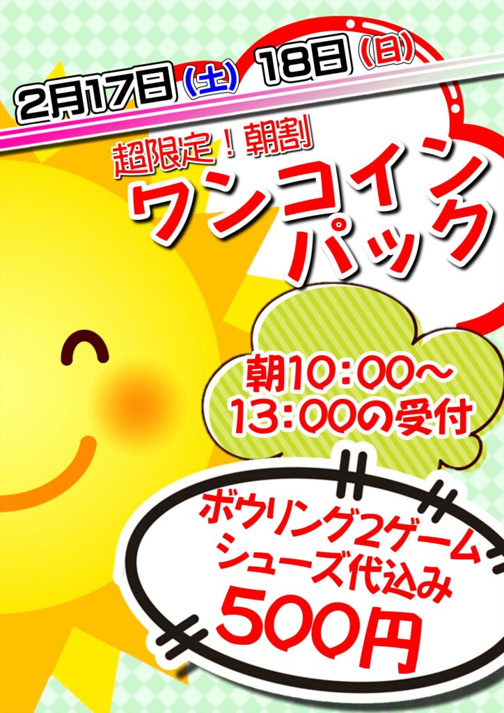 2/17・2/18開催 超限定!朝割 ワンコインパック 2024.02.15 お知らせ イベント Post Share Hatena LINE RSS feedly Pin it note この記事のタイトルとURLをコピーする 2/17(土)・18(日)は 超限定!朝割 ワンコインパックを開催します! 朝10:00~13:00の受付となります ボウリング2ゲームにシューズ代も込みでなんと500円!! 是非お越しください♪ Post Share Hatena LINE RSS feedly Pin it note 2/23~2/25 うまい棒チャレンジ開催!! 前の記事 3/8 姫路プロチャレンジ開催!! 次の記事